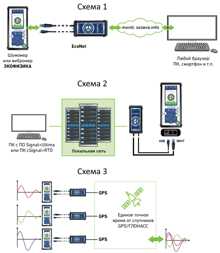 Адаптеры-коммуникаторы EcoNet позволяют организовывать синхронные измерения в удалённых друг от друга точках измерений через подключение к спутникам ГЛОНАСС. Информация об адаптерах приведена в приложенной листовке и на нашем сайте: https://www.octava.info/Adapter-communicator_Eco-Net.