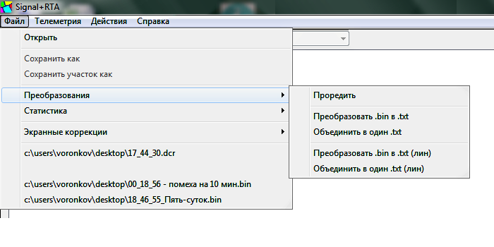 - Преобразование бинарных файлов временных реализаций сигналов в текстовый формат (TXT)