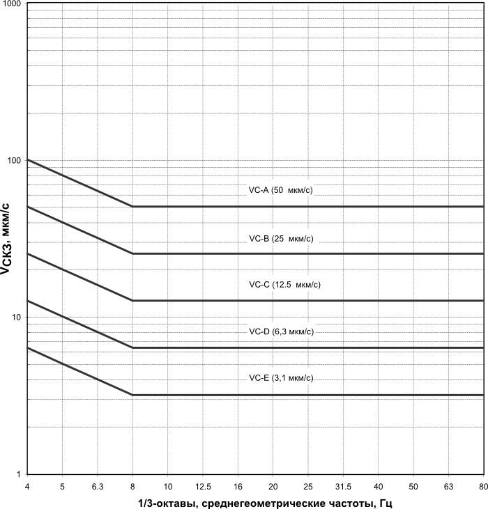 Одним из наиболее популярных методов оценки вибрации в помещениях, предназначенных для установки высокоточного оборудования, являются так называемые вибрационные критерии (vibration criteria), или кривые VC. Изначально этот метод оценки изложен в рекомендациях IEST RP-CC012.